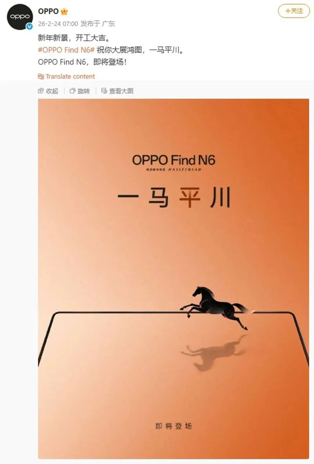 就在年后开工第一天,OPPO 官方放出了一张预热海报:一匹骏马在一块带有黑色边框的平面上飞驰,配文「一马平川」。借着马年的彩头,这句文案的潜台词其实非常直白——不出意外的话,进一步抹平日益挑剔的屏幕折痕,依然是 Find N6 这一代的核心任务。