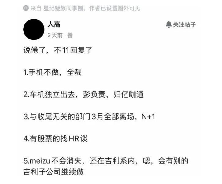 其实更早之前,网上就流传出一份星纪魅族内部员工的爆料,其中透露了多条关于公司业务调整的重磅消息,和如今的猜测高度重合。