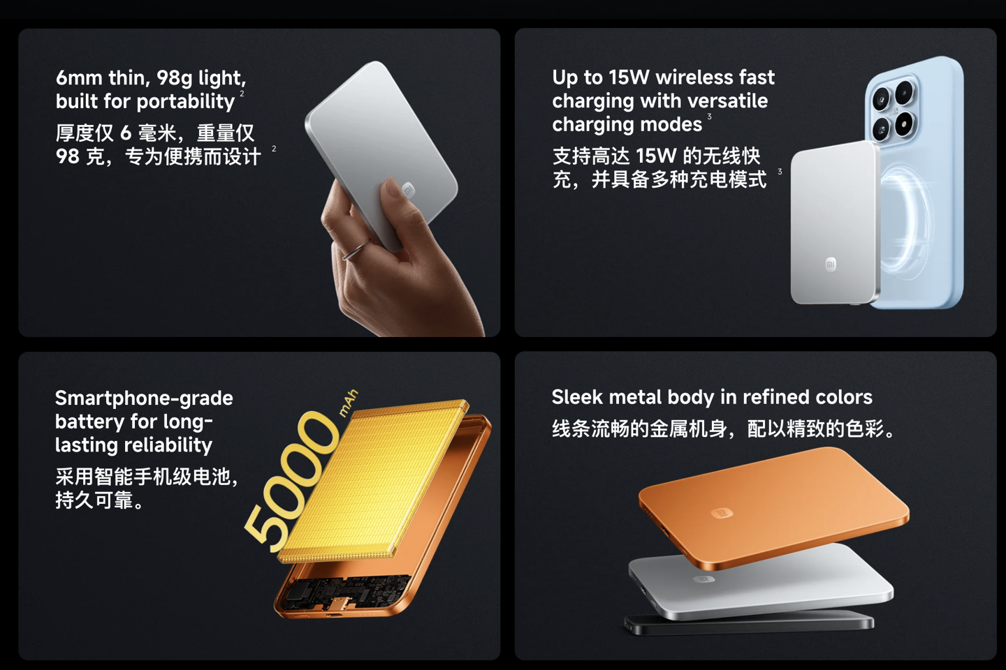 IT之家 2 月 28 日消息,小米超薄磁吸充电宝 5000 15W 现已在 MWC 2026 展会发布,新品主打 6mm 超薄设计,重量 98g,型号与国内的金沙江相同,拥有黑色、银色以及橙色三种配色可选,支持 15W 无线充电、22.5W 有线充电。