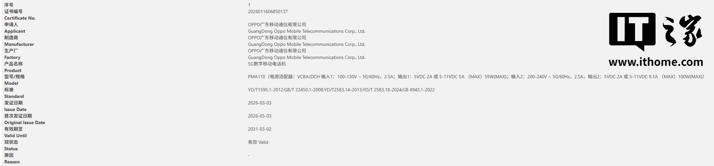 IT之家 3 月 4 日消息,昨日有一款型号为 PMA110 的 OPPO 新机通过了国家 3C 质量认证,经 @数码闲聊站 确认为即将发布的 OPPO Find X9 Ultra。