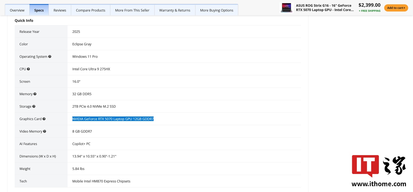 此外,根据外媒 Tom's Hardware 的发掘,华硕、惠普部分 2025 款游戏笔记本电脑在第三方电商平台上也显示了 12GB 版 RTX 5070 Laptop GPU 相关信息。