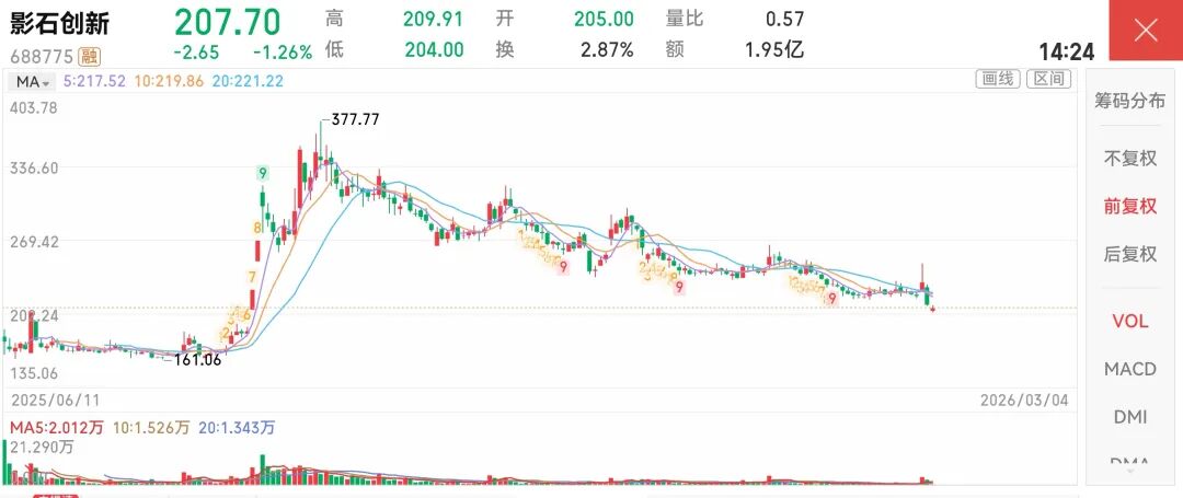 公告发布后的首个交易日,影石股价早盘一度大涨超过13%,但很快冲高回落,最终收盘涨幅不足6%。按当日收盘价计算,相较去年9月高点,股价已回撤约四成。