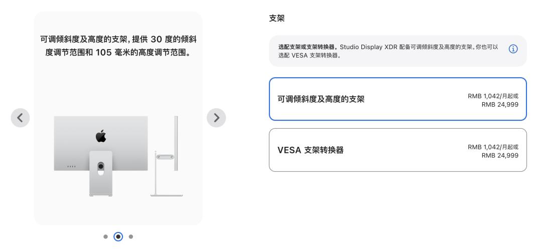 无论你买两万多的 Studio Display XDR 还是一万多的 Studio Display,显示器支架和 VESA 转接器依然只能二选一,单买要付费: