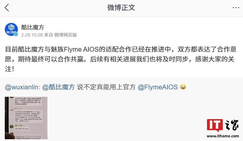 IT之家 3 月 5 日消息,酷比魔方上月发文称与魅族 Flyme AIOS 的适配合作已经在推进中,双方都表达了合作意愿,期待最终可以合作共赢。