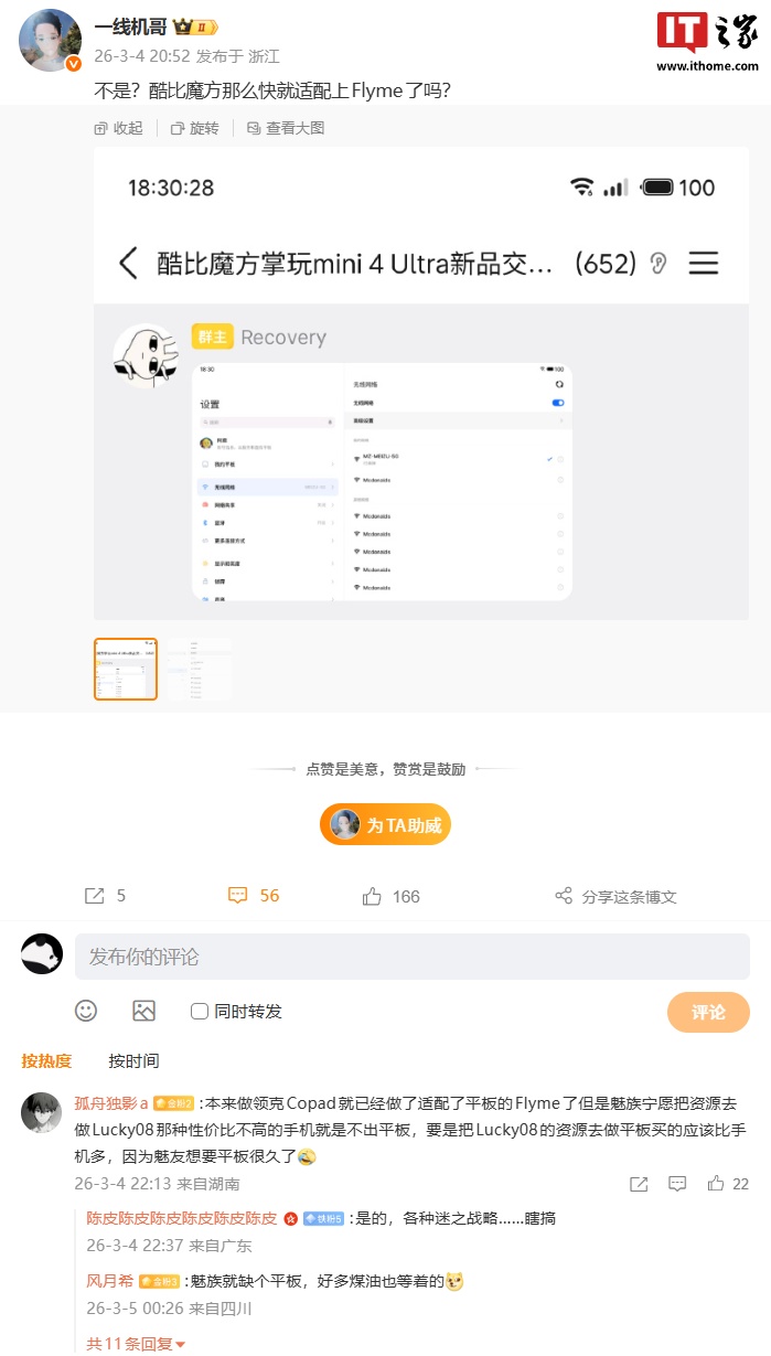《酷比魔方称魅族 Flyme 系统“在谈适配”,官微昨天刚问“要不要谈合作”》