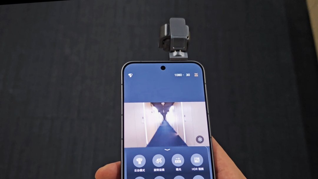 视频画面显示,该机在相机 App 左滑可进入云台模式,随后可激活那颗硕大电动翻转镜头,支持拍照、录像功能。视频中,@Aaron是个理工男 拍摄了一段在走廊里的旋转运镜视频,画面整体较为平稳、流畅。