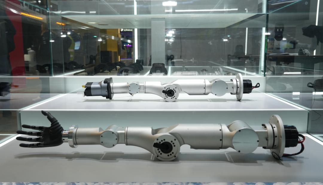 展台上陈列的不仅是机器人的整机骨架,还有谐波减速器、行星滚柱丝杠这些机器人“心脏”的精密部件。