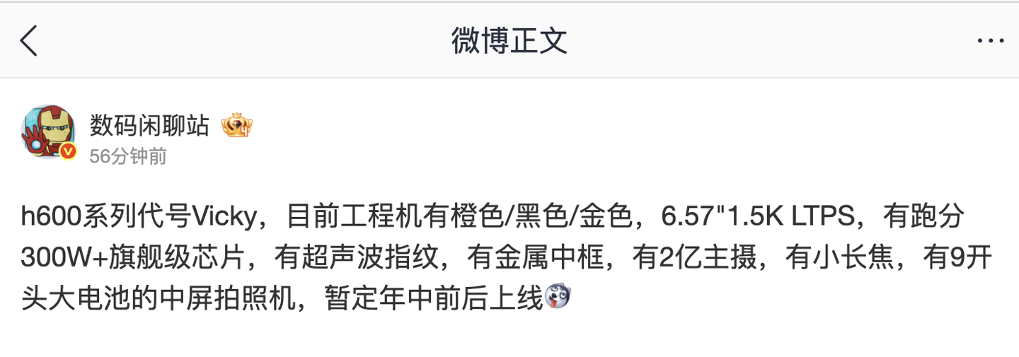 IT之家 3 月 6 日消息,博主 @数码闲聊站 今天在微博曝光了某厂代号“Vicky”的 h600 系列手机。