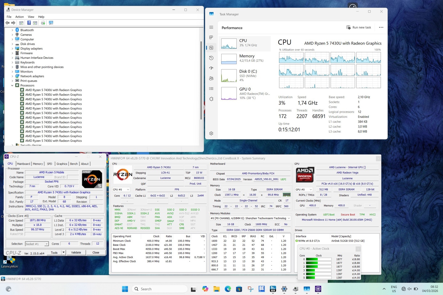这台笔记本的 BIOS 里也写着处理器是锐龙 5 7430U,Windows 系统层也被修改,所有系统工具都让用户误以为购买了锐龙 5 7430U。