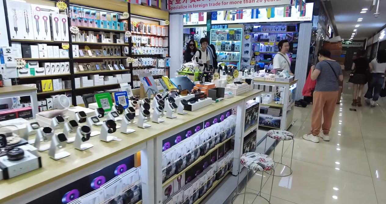 走进一家市场,最先看到的就是排列的琳琅满目的商品:摆满整整三个玻璃柜的二手手机,正在静候你的挑选;一条看不见尽头的走廊,两侧全是山寨手表、手机配件、充电器、数据线、无线耳机、手机壳、吹风机,看着让人眼花缭乱。