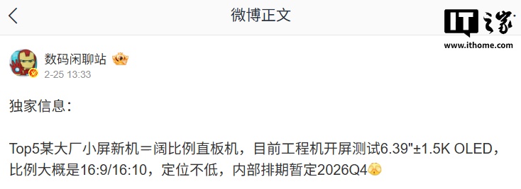 IT之家注意到,该博主上个月曾爆料,Top5 某大厂小屏新机=阔比例直板机,目前工程机开屏测试 6.39 英寸 ±1.5K OLED 屏幕,该机被认为是华为旗下。新机的屏幕比例大概是 16:9 或 16:10,定位不低,内部排期暂定 2026 年第四季度,并称“基本上就是阔折叠的不可折叠态。”