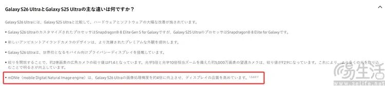 另一方面,就算是三星,在此前关于Galaxy S26系列的宣传文案里,其实也有各种暗示其显示效果升级到了10bit的细节。比如在日本官网,就可以找到有说法称,“移动数字自然图像引擎 (mDNIe) 将图像处理精度提高了四倍”。而8bit面板和10bit面板之间的发色数差距,恰好就是四倍。