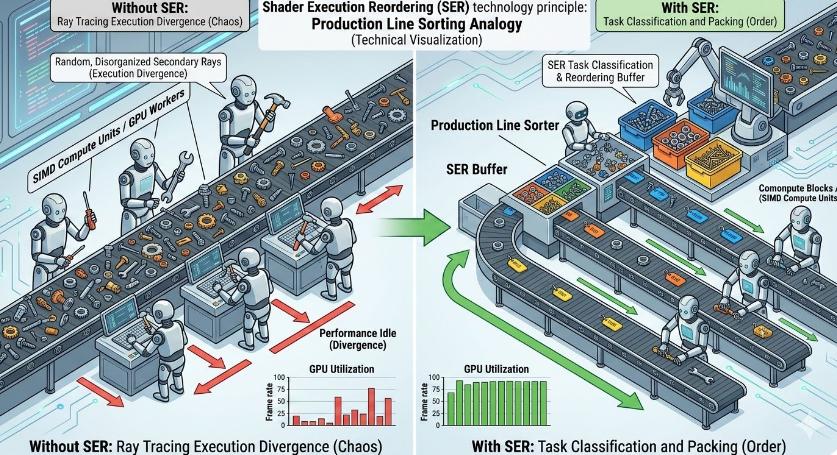 SER,全名Shader Execution Reordering(着色器执行重排序),这项技术最初由英伟达研发,随后被微软相中并纳入DirectX 12的开放规范中,其主要作用是通过对光追模式下的GPU计算线程进行重新排列,归纳相似的工作负载,让GPU的并行计算能力得到充分释放。