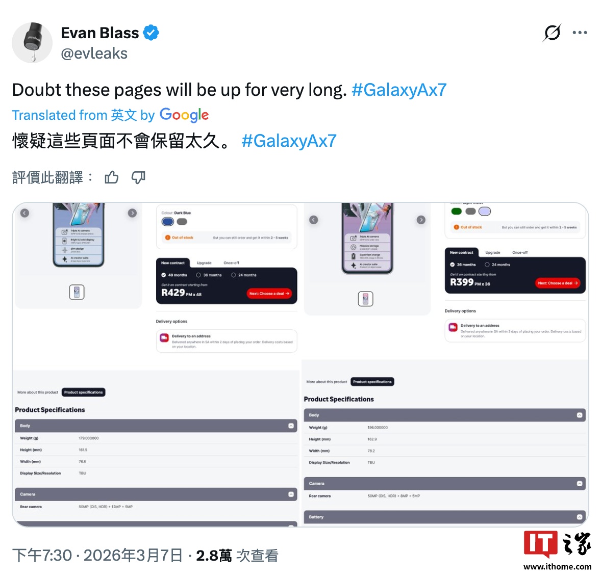 IT之家 3 月 9 日消息,消息人士 Evan Blass 上周(3 月 7 日)在 X 平台发文,曝光一家电商平台泄露的三星 Galaxy A57、A37 手机详细参数表。
