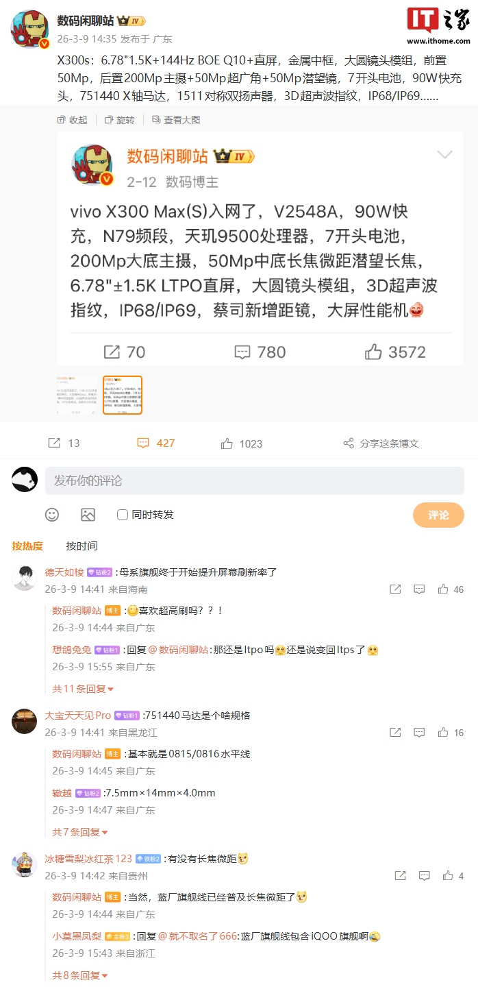 IT之家 3 月 9 日消息,vivo 通信科技有限公司产品经理韩伯啸今日首度曝光了 vivo X300s。据介绍,新机“里里外外都很 Max”,是 vivo X300 标准版的迭代,号称是“一部在性能和影像上双双没有妥协的超级标准版”。