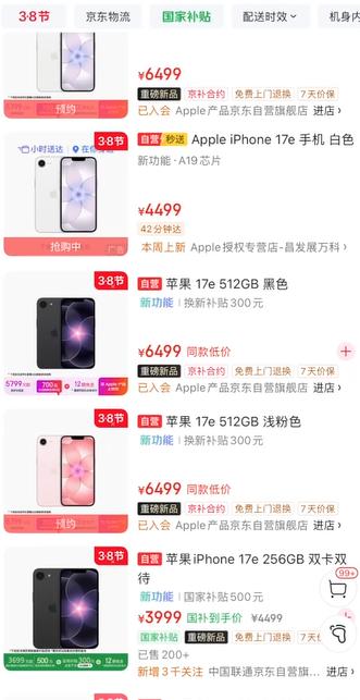 价格,是 iPhone 17e 最具竞争力的底牌。该机官方定价 4599 元,结合 2026 年持续生效的国补政策,可直接享受 500 元补贴,到手价仅 4099 元,部分电商平台叠加优惠后,价格还能进一步下探。
