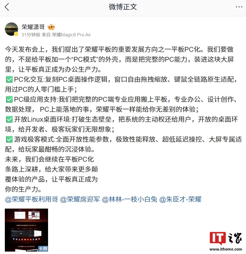 IT之家 3 月 10 日消息,在今天的荣耀 Magic V6 旗舰新品发布会结束后,荣耀终端股份有限公司全场景产品线 @荣耀潇哥 分享了平板 PC 化升级计划。