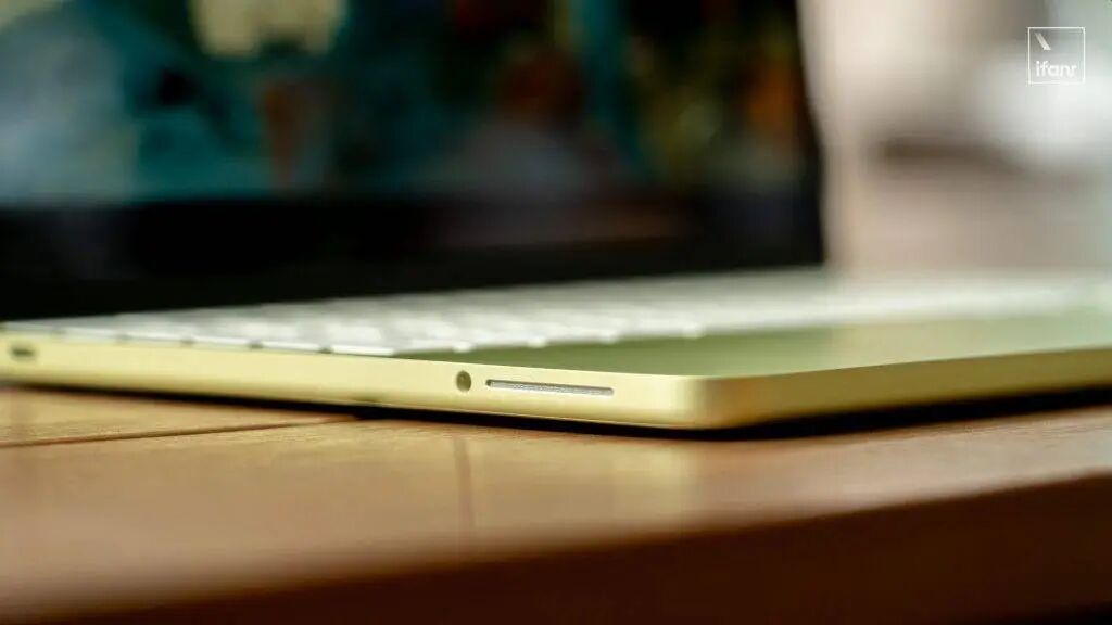 爱范儿手上的这台配色是「柑橘黄」,其实就是浅黄色,总体比较明艳。除此之外,还有同为「水果风」的桃粉色,以及更低调的银色和靛蓝色。