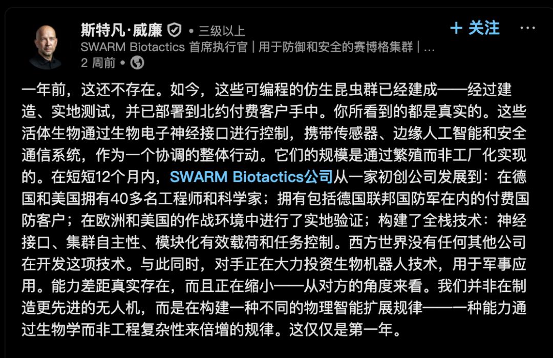 公开资料显示,这家名叫SWARM Biotactics的公司,确实在做基于活体昆虫的生物机器人系统,目标场景就是国防、国家安全、灾害响应和工业巡检。