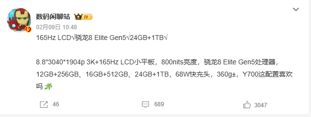 但第五代Y700还是给了骁龙8 Elite Gen5。