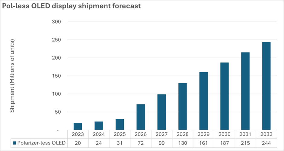 市场调研机构Omdia发布的数据显示,全球无偏光片OLED显示面板出货量将在2032年达到2.44亿片,2026至2032年期间的复合年增长率(CAGR)为 22.7%。