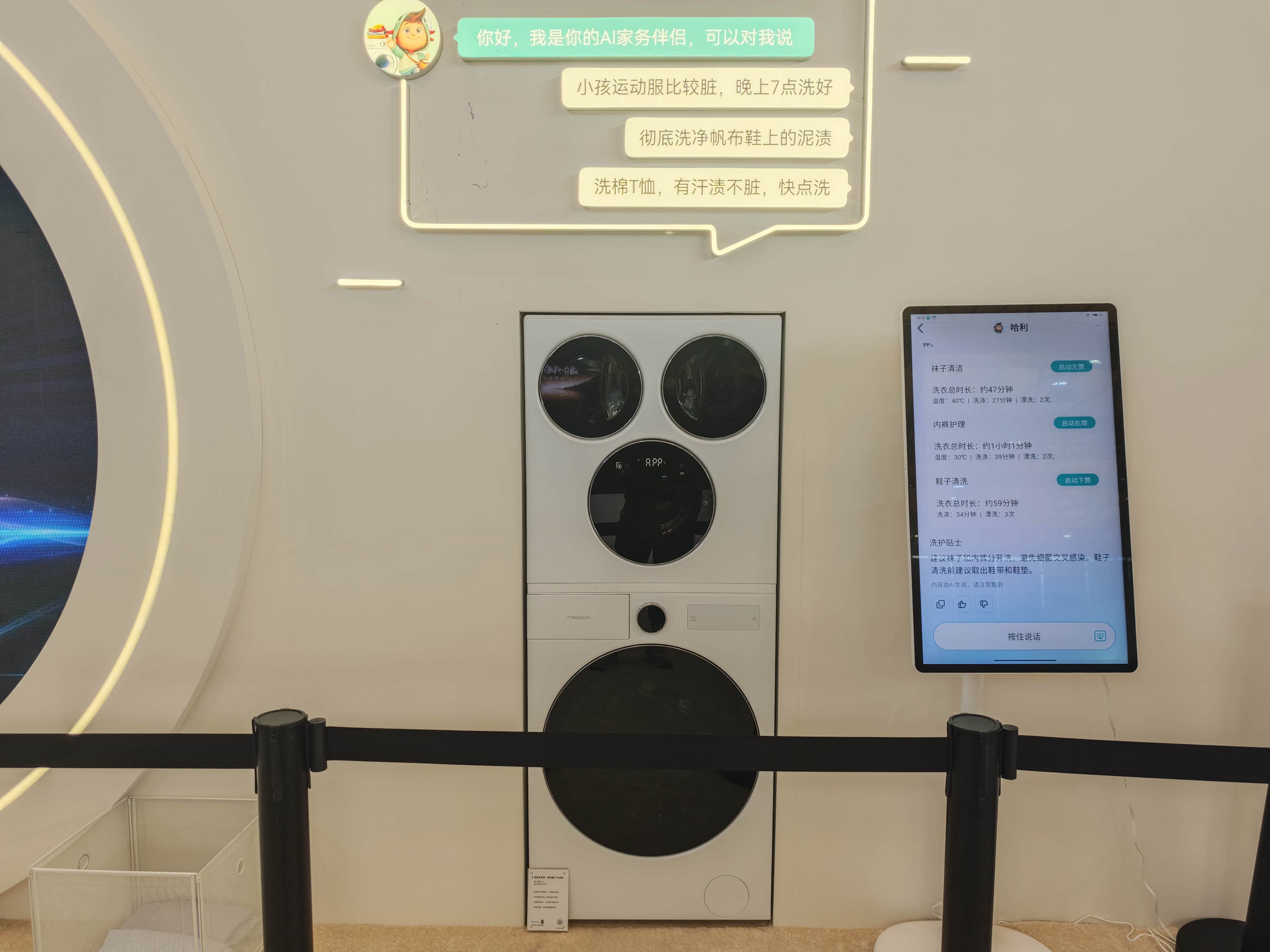 海信展台,雷科技看到了今年AWE上名气不小的一款洗衣机产品:全家筒棉花糖U7S四筒洗衣机,集洗衣、热泵式烘干、婴儿/宠物用品洗烘、内衣洗烘、洗鞋、护鞋六大功能于一体,一台产品就能解决全家所有洗涤任务。