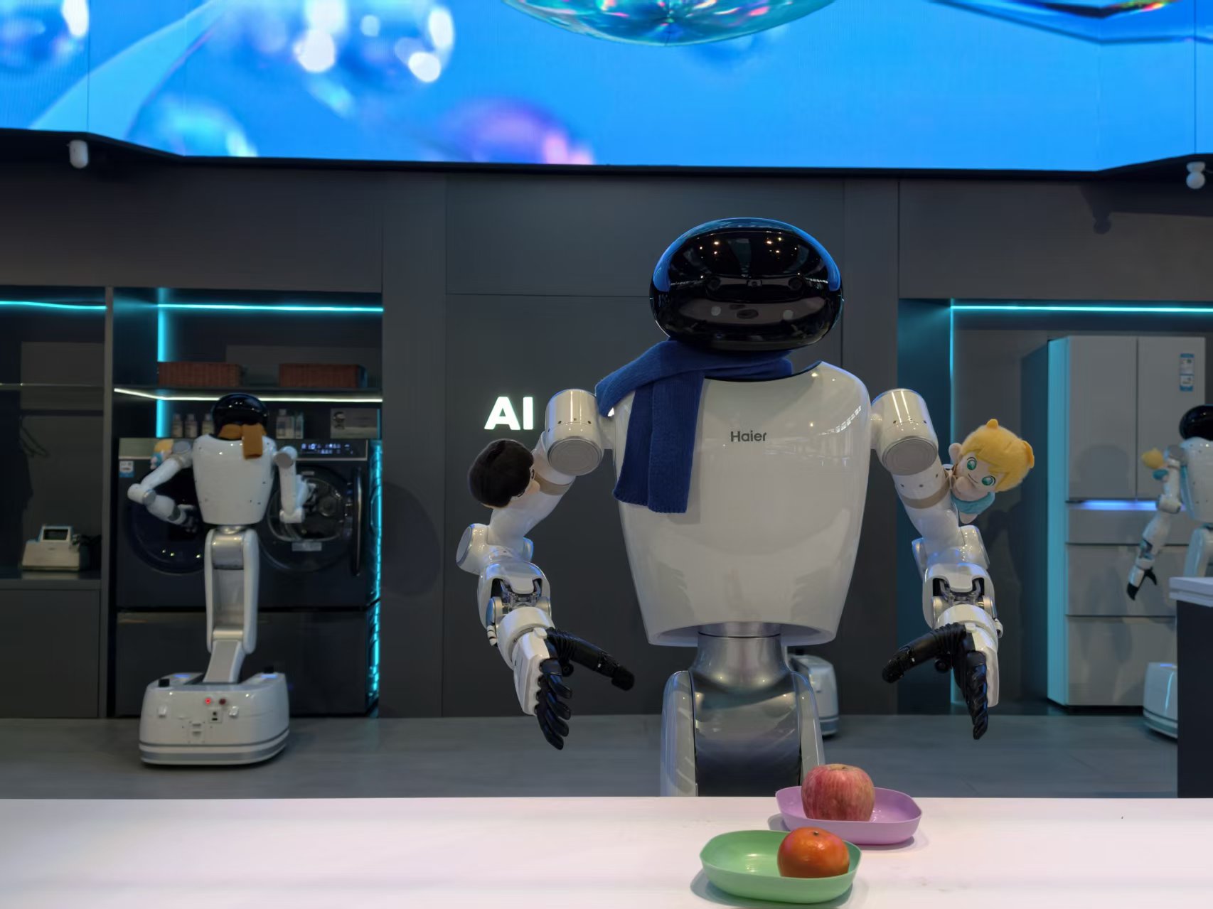 结合AI和机器人技术应用体系,海尔展示了旗下代表未来的「无人家务」生活空间理念;在海信「无家务之家」展厅,一整套家庭机器人体系在工作,包括管家机器人Savvy、陪伴机器人Moii,以及人形机器人Harley。