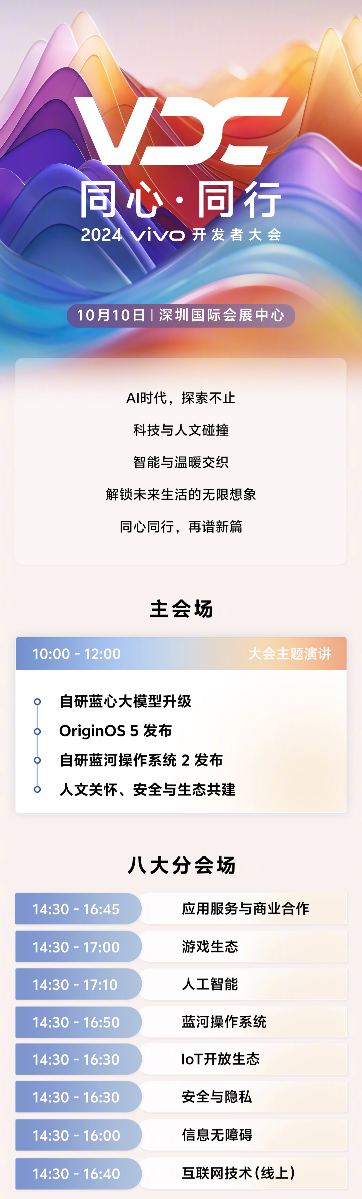 2024 vivo 开发者大会于今日在深圳国际会展中心举行,在上午的主会场中,vivo 公布了 OriginOS 5、蓝河操作系统 2 等主要内容。今日下午的分会场中,vivo 将就各项内容向开发者进行详细介绍,IT之家附日程表如下:
