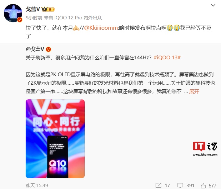 iQOO 产品经理 @戈蓝V 今日回复网友关于新机 iQOO 13 的发布时间时直言“就在本月”。