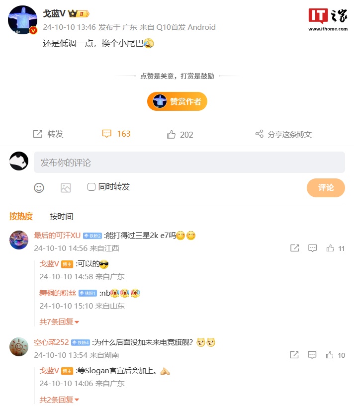 另外他本人最新微博小尾巴也已更换,编辑显示为“来自 Q10 首发 Android”。从评论区讨论来看,新机 Slogan 预计为“未来电竞旗舰”。