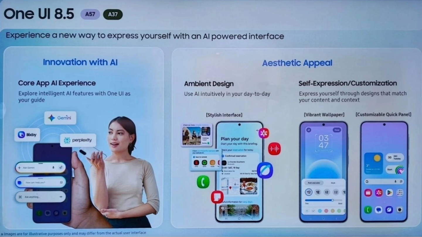 系统方面,Galaxy A57 出厂预装基于 Android 16 的 One UI 8.5 操作系统,深度整合了 Perplexity 人工智能搜索引擎与 Now Brief 功能,并内置了升级版的 Bixby 语音助手。