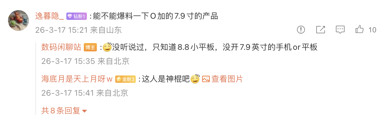 后续有用户在评论区询问:“果子的打磨又只是换芯片级的打磨吗”,博主回复道:“目前只知道换了 OLED,你猜是不是 60Hz OLED”;另一名用户则询问道:“能不能爆料一下 O 加的 7.9 寸的产品”,博主则回复道:“没听说过,只知道 8.8 小平板,没开 7.9 英寸的手机 or 平板”。