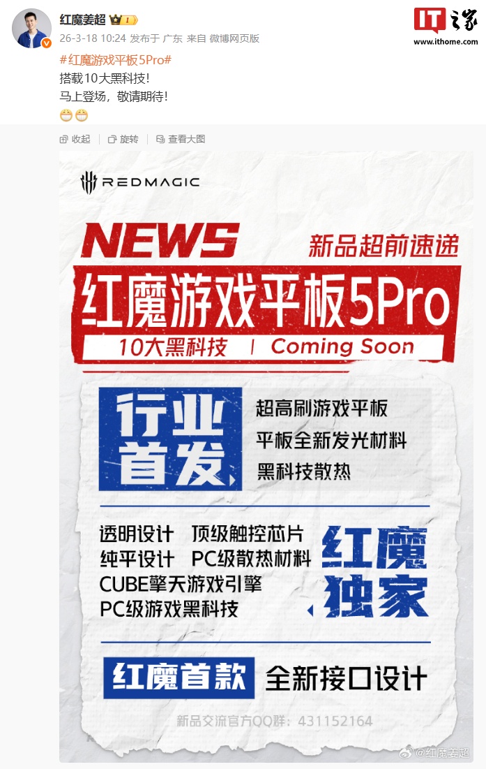 IT之家 3 月 18 日消息,红魔游戏平板 5 Pro 已开启前瞻预热,官方表示新机“马上登场”。