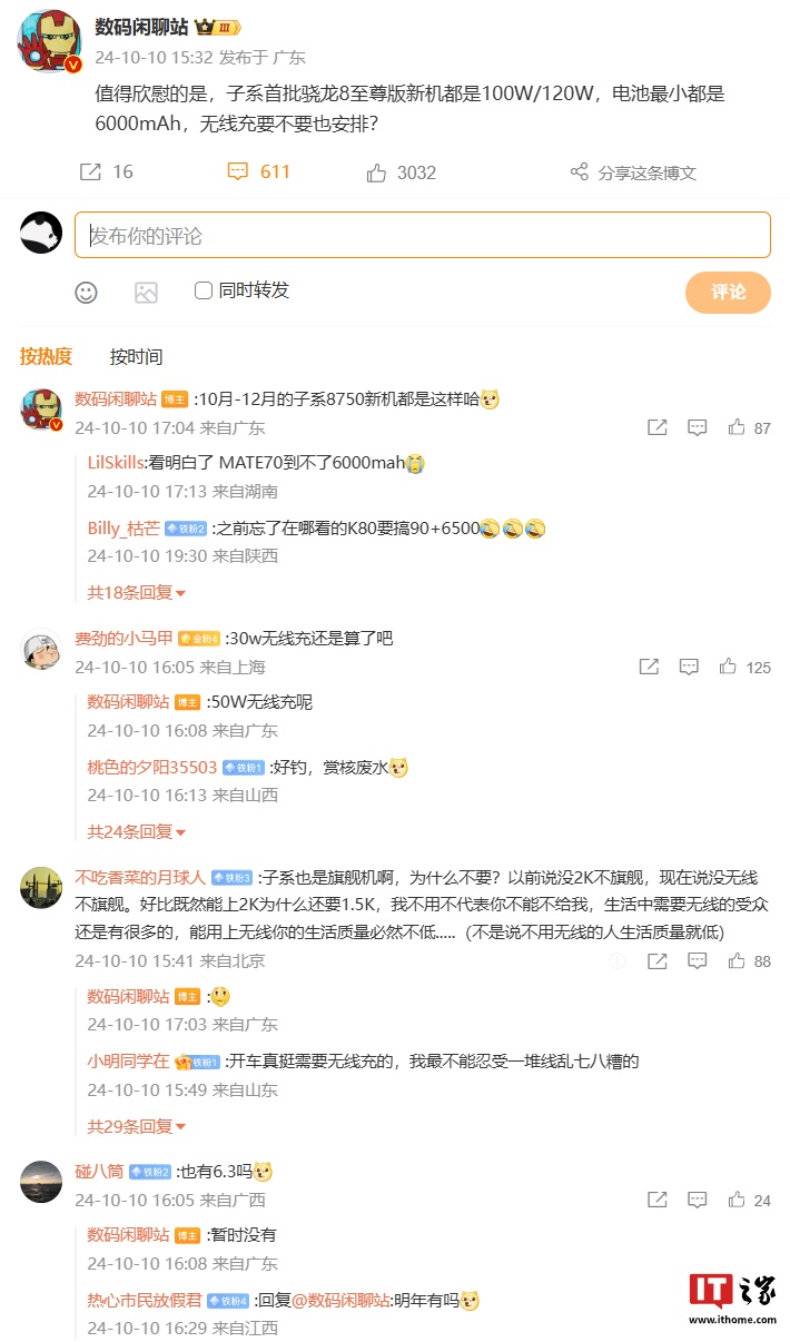 IT之家 10 月 10 日消息,博主 @数码闲聊站 今日发文透露,各手机厂商子系首批骁龙 8 至尊版新机支持 100W / 120W 快充,电池容量最低 6000mAh。