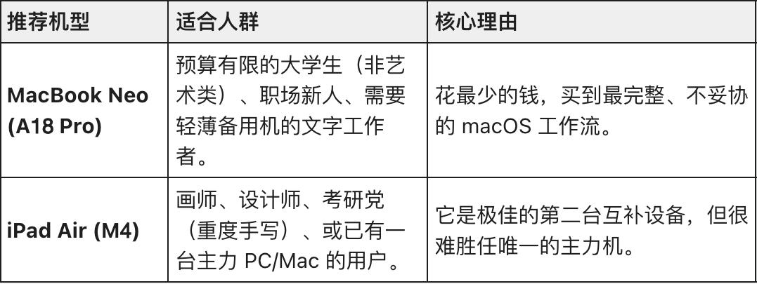 说到底,选 iPad,买的是「屏幕的自由」;选 MacBook Neo,买的是「键盘的安稳」。