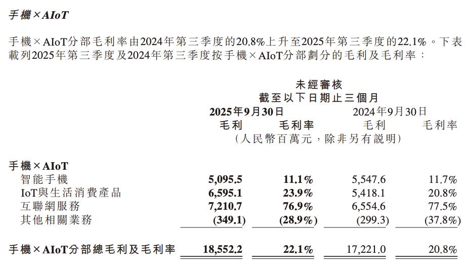 以小米为例,虽然其是一家智能手机厂商,却主要靠互联网服务变现。财报显示,2025年Q3,小米互联网服务的毛利率高达76.9%,赚取的毛利为72.11亿元,占手机×AIoT分部总毛利的38.87%,远高于智能手机业务。
