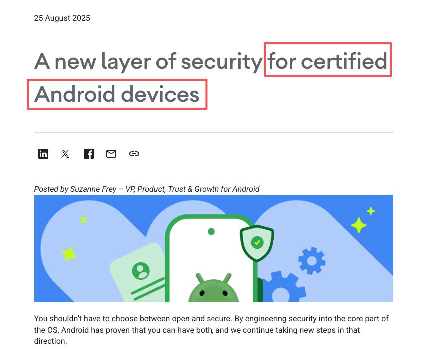 答案大概还是得回到谷歌这次的通告本身,这里面最值得琢磨的,其实不是 “限制侧载” 这几个字,而是谷歌特意加上的那个前提:for certified Android devices,翻译成大白话就是 ——