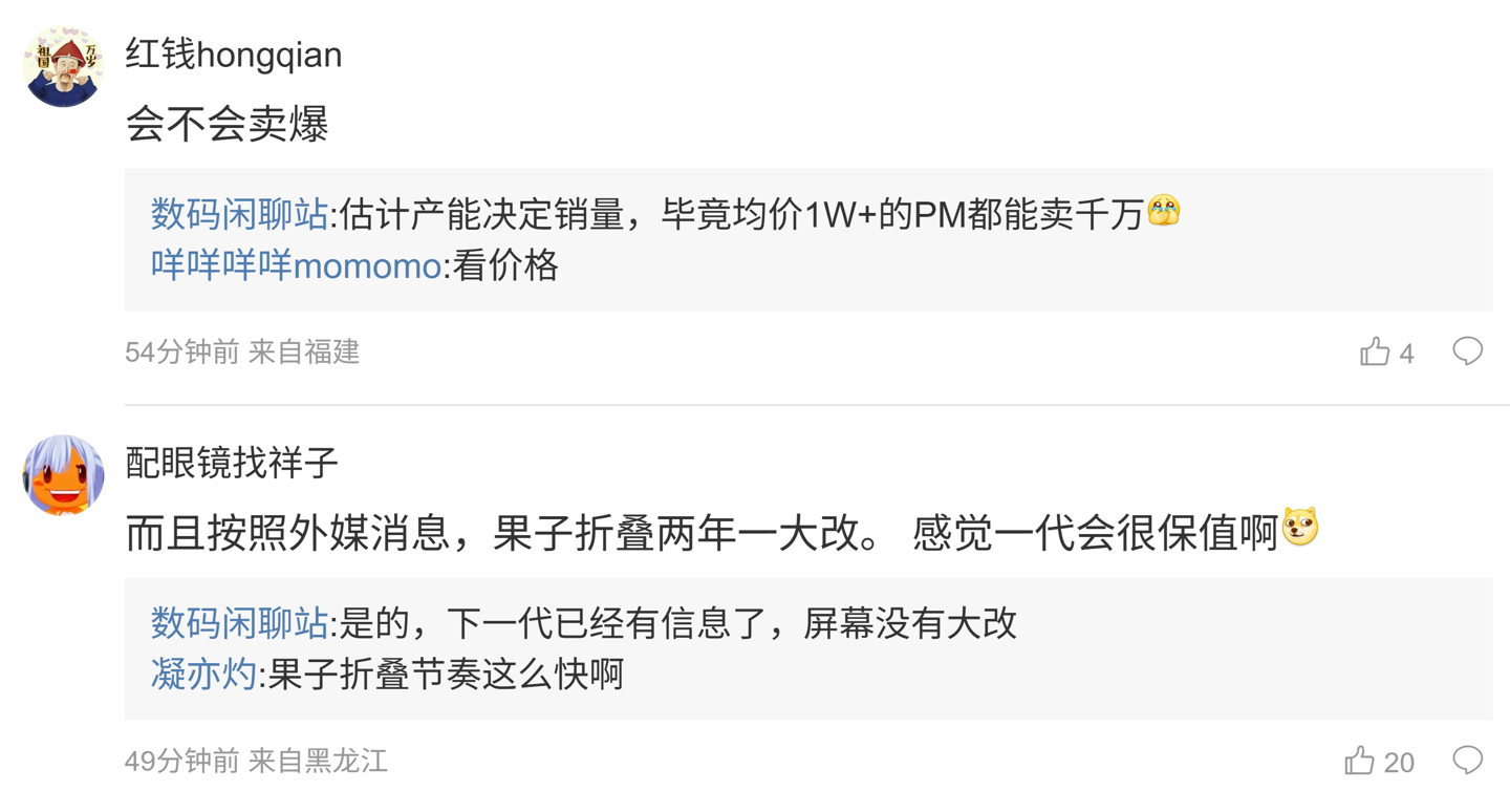 后续有用户在评论区表示:“而且按照外媒消息,果子折叠两年一大改。感觉一代会很保值啊”,博主回复道:“是的,下一代已经有信息了,屏幕没有大改”;另一名用户则询问道:“会不会卖爆”,博主则回复道:“估计产能决定销量,毕竟均价 1W+ 的 PM 都能卖千万”。