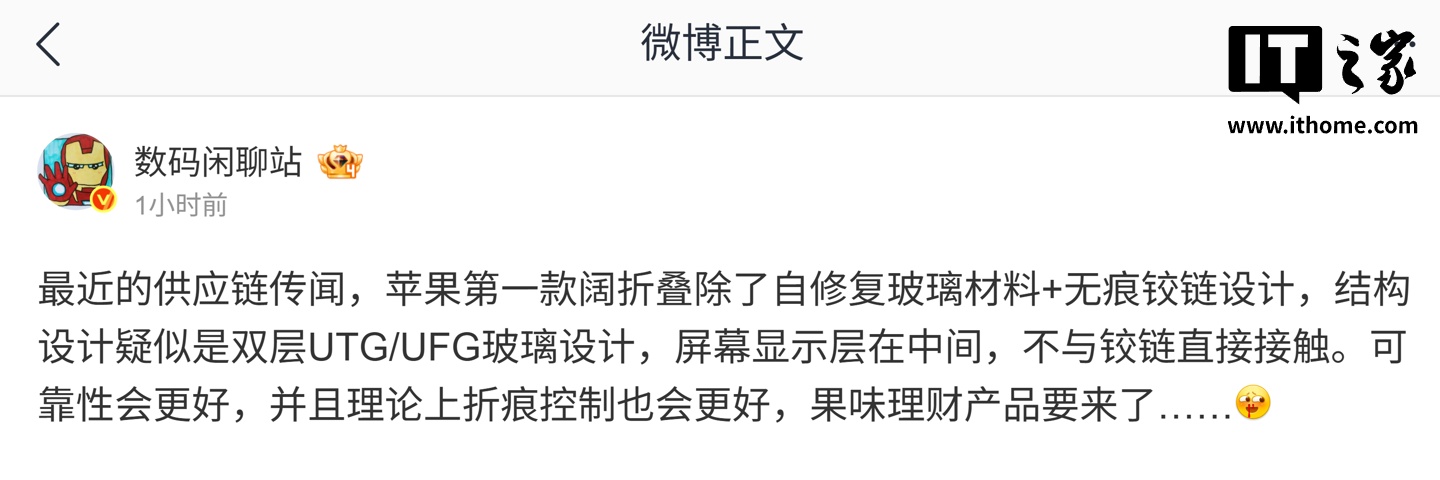 IT之家 3 月 23 日消息,博主 @数码闲聊站 今天在微博透露,苹果的第一款阔折叠手机除了自修复玻璃材料 + 无痕铰链设计,还有其他花招。