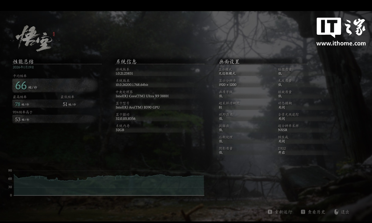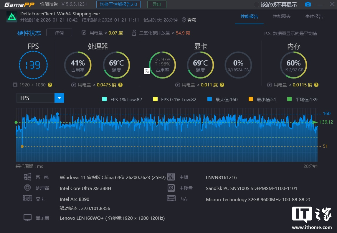 使用联想小新 Pro GT 16 AI 元启版再跑一遍,平均帧数为 69 帧,1% Low 为 57 帧,也达到了能玩的水平,但是相较于华硕天选 Air 2026 差距还是比较明显的。