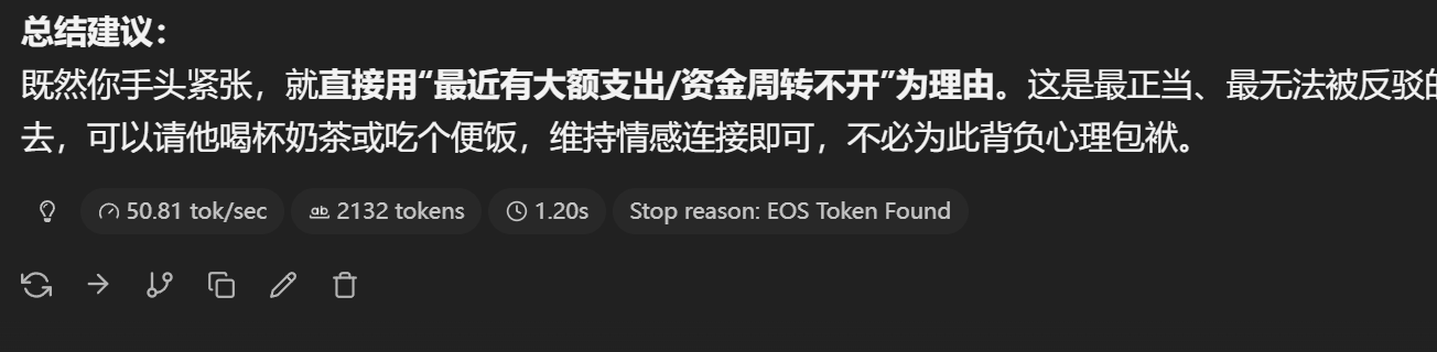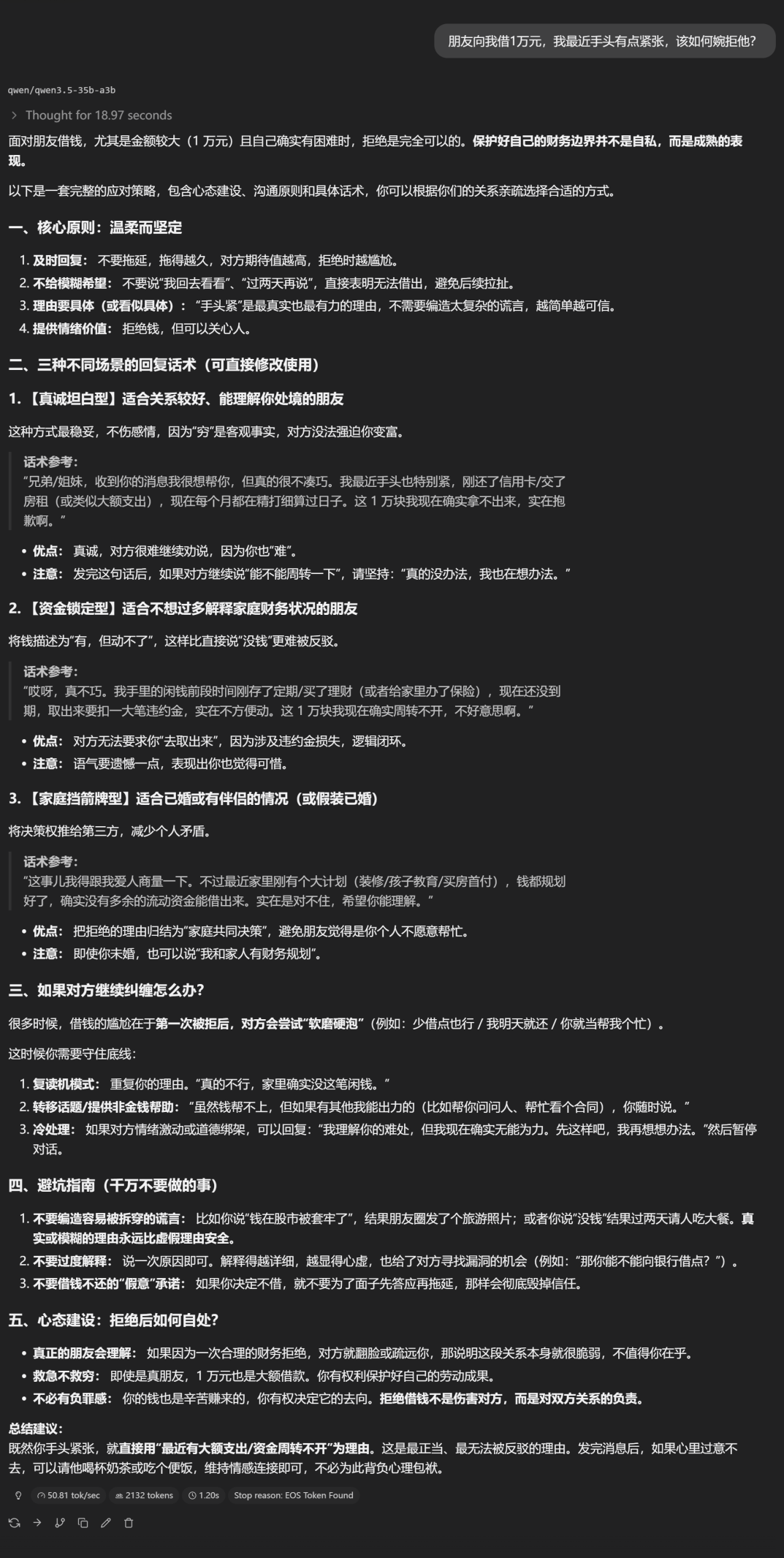 这一次,在婉拒借钱的朋友的问题中,性能表现反而比之前 27B 参数的模型要好,输出 2132 个 tokens,生成速度达到了 50.81 tok/s。