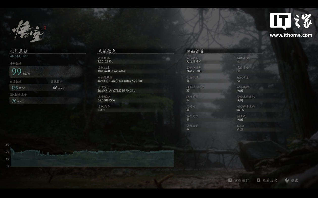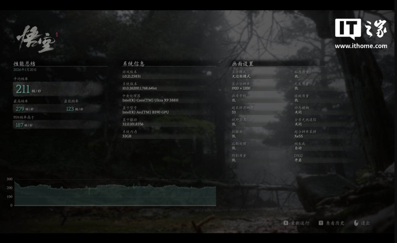 而酷睿 Ultra X9 处理器 388H 以同样的画质预设运行该游戏,游戏平均帧数为 308 帧,1% Low 帧率为 160 帧。平均帧明显低于锐龙 AI MAX+ 392,不过 1% Low 帧方面高出一些。
