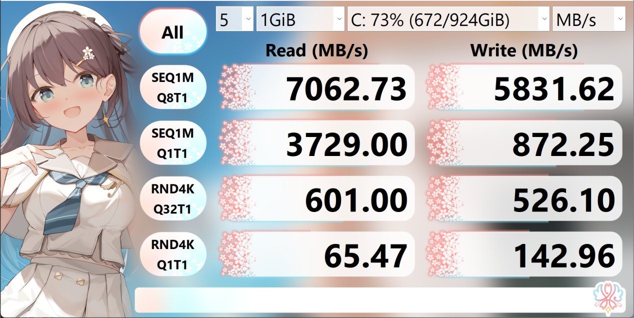 硬盘读写速度方面,测得 SEQ1MQ8T1 读取速度为 7062.73 MB/s,写入速度为 5831.62 MB/s。