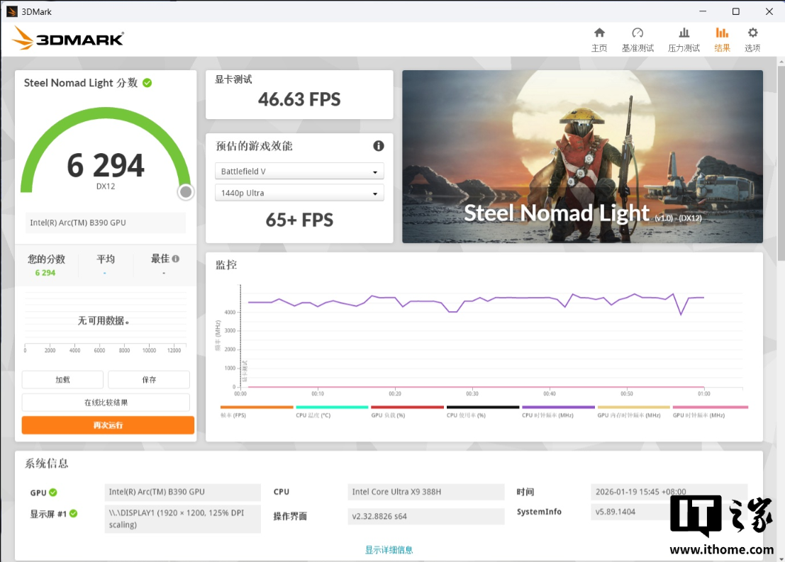 再看联想小新 Pro GT 16 AI 元启版,酷睿 Ultra X9 处理器 388H 得分为 6294 分,显卡测试成绩为 46.63 FPS,表现几乎只是华硕天选 Air 2026 的一半。