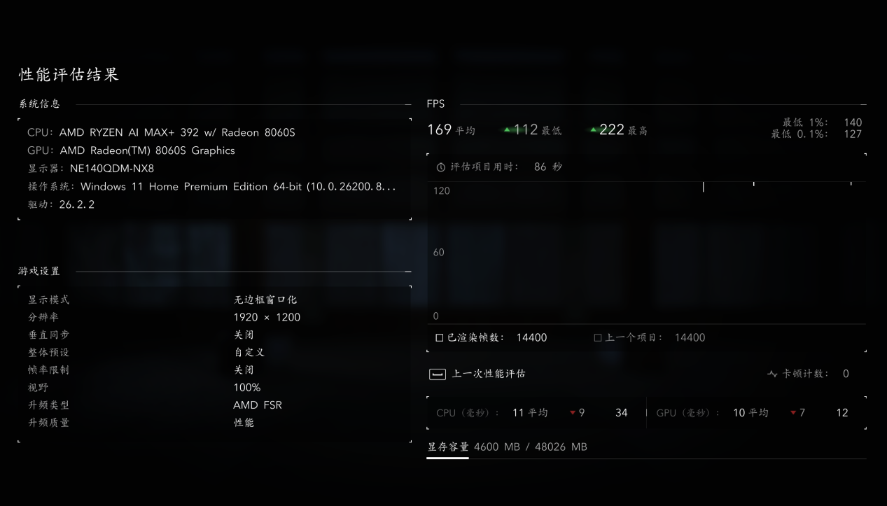 然后是 3A 单机大作,首先测试的是《刺客信条:影》,这款游戏对 CPU、GPU 的性能要求都很高,在 1200P 分辨率 + 手动全低画质预设 + FSR 性能 + FSR 帧生成的画面设置下,先使用华硕天选 Air 2026 运行游戏自带基准测试,游戏平均帧数为 169 帧,1% Low 为 140 帧,这个表现完全可以满足畅玩的要求了。