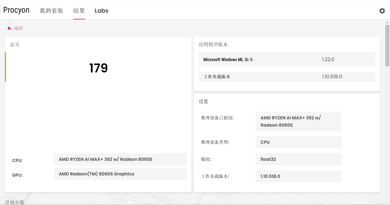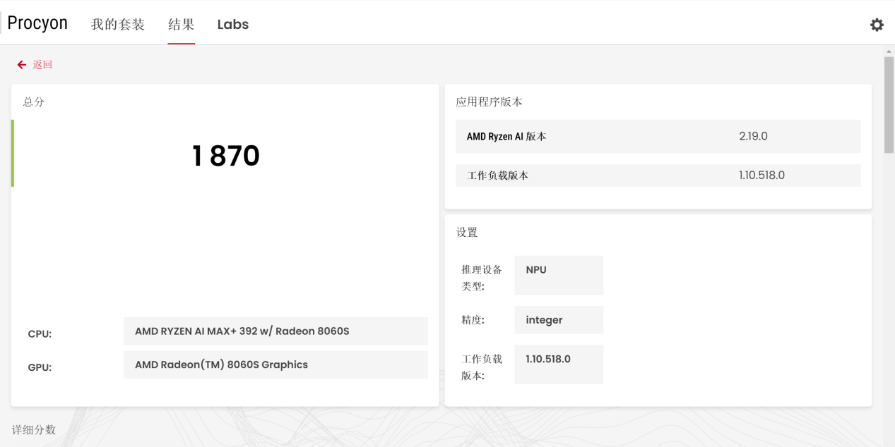 AMD 锐龙 AI Max+392 处理器还内置 50 TOPS XNDA2 NPU,在 UL Procyon 针对 Ryzen AI NPU integer 精度的跑分测试中,成绩为 1870 分。