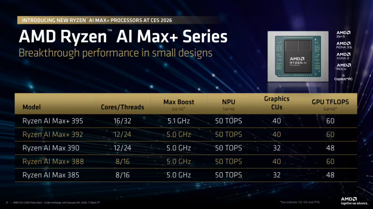 作为锐龙 AI Max+ 395 的核心精简版,锐龙 AI Max+392 精准切中了旗舰轻薄本的市场需求痛点。它在精简 CPU 核心规格、拉低旗舰级产品准入门槛的同时,完整保留了满血版 Radeon 8060S 集显、超大容量缓存与高带宽统一内存架构,既延续了锐龙 AI Max + 系列的旗舰级性能底子,也让更多用户能以相对更亲民的价格,获得轻薄机身与满血算力兼顾的使用体验。