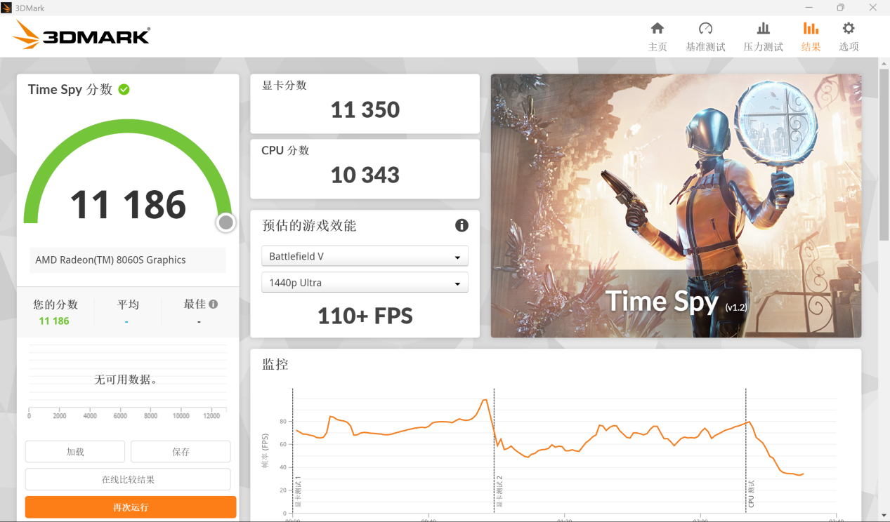 GPU 部分,在 3D Mark Time Spy 测试中,锐龙 AI MAX+ 392 的 Radeon 8060S 集显的显卡分数为 11350 分,综合得分为 11186 分。