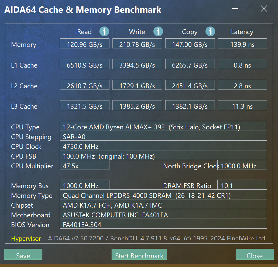 最后我们再来看一下华硕天选 Air 2026 锐龙 AI Max 版在其他方面的理论性能测试表现。首先是内存速率方面,测得这款笔记本搭载的 LPDDR5-4000 SDRAM 内存读取速度为 120.96 GB/s,写入速度为 210.78 GB/s,拷贝速度为 147.00 GB/s,内存时延为 139.9 ns。