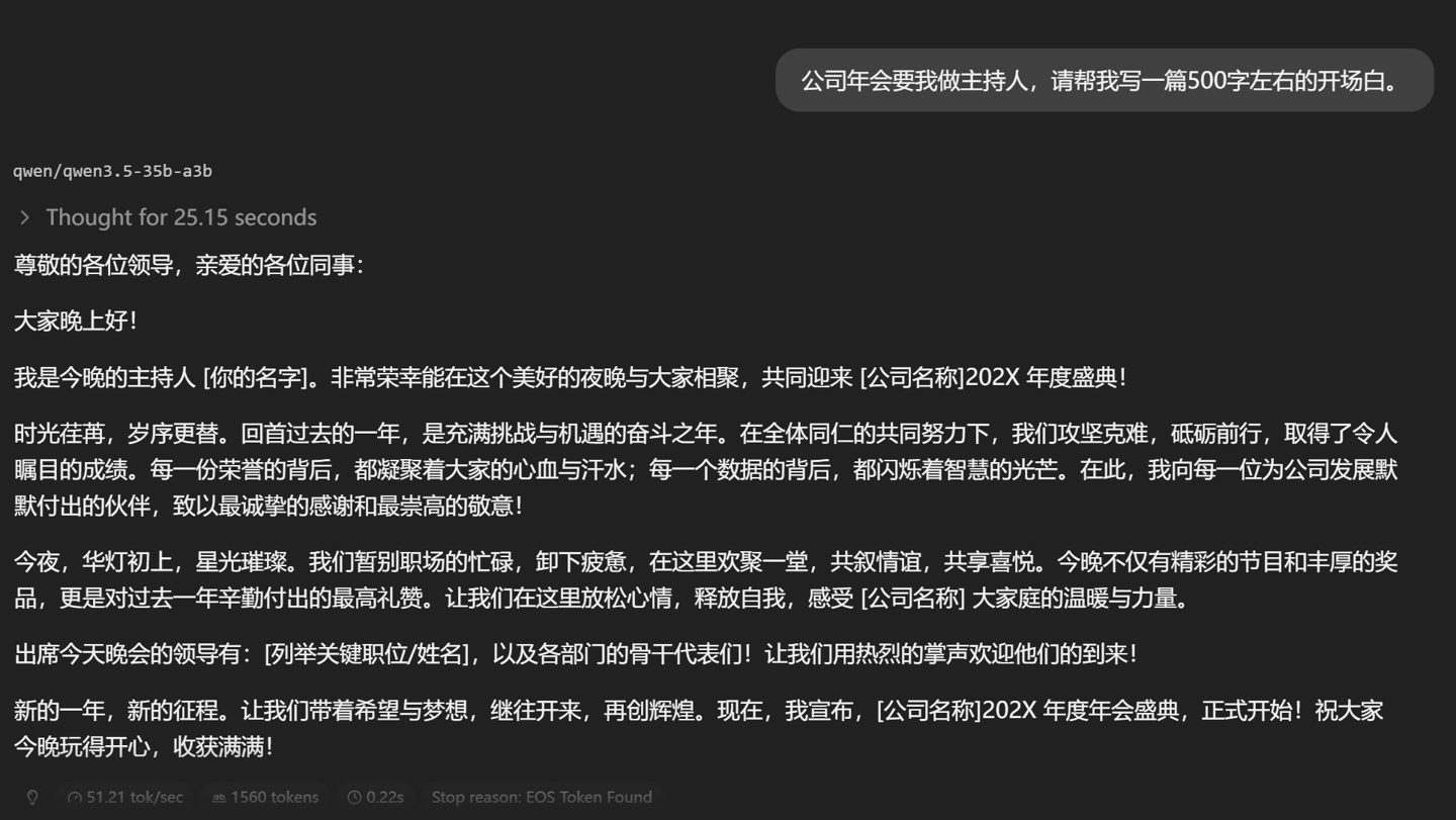 再问公司年会开场白的问题,表现同样是非常出色,思考推理时间 21.15 秒,输出 1560 tokens,速度为 51.21 tok/s